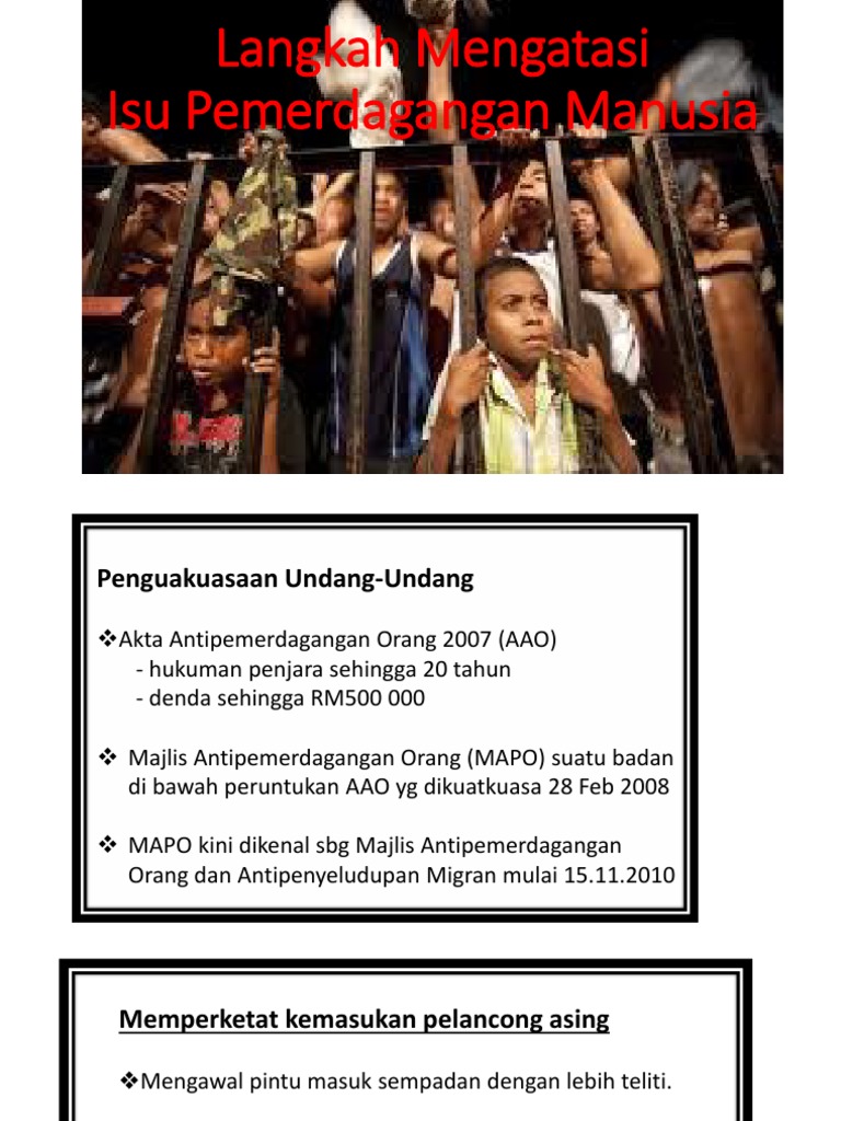 Kesan Pemerdagangan Manusia Dan Langkah. Kerajaan Malaysia perlu meningkatkan usaha membanteras jenayah pemerdagangan orang memandangkan usaha yang diambil sebelum ini tidak berkesan dan. Isu pemerdagangan manusia telah.